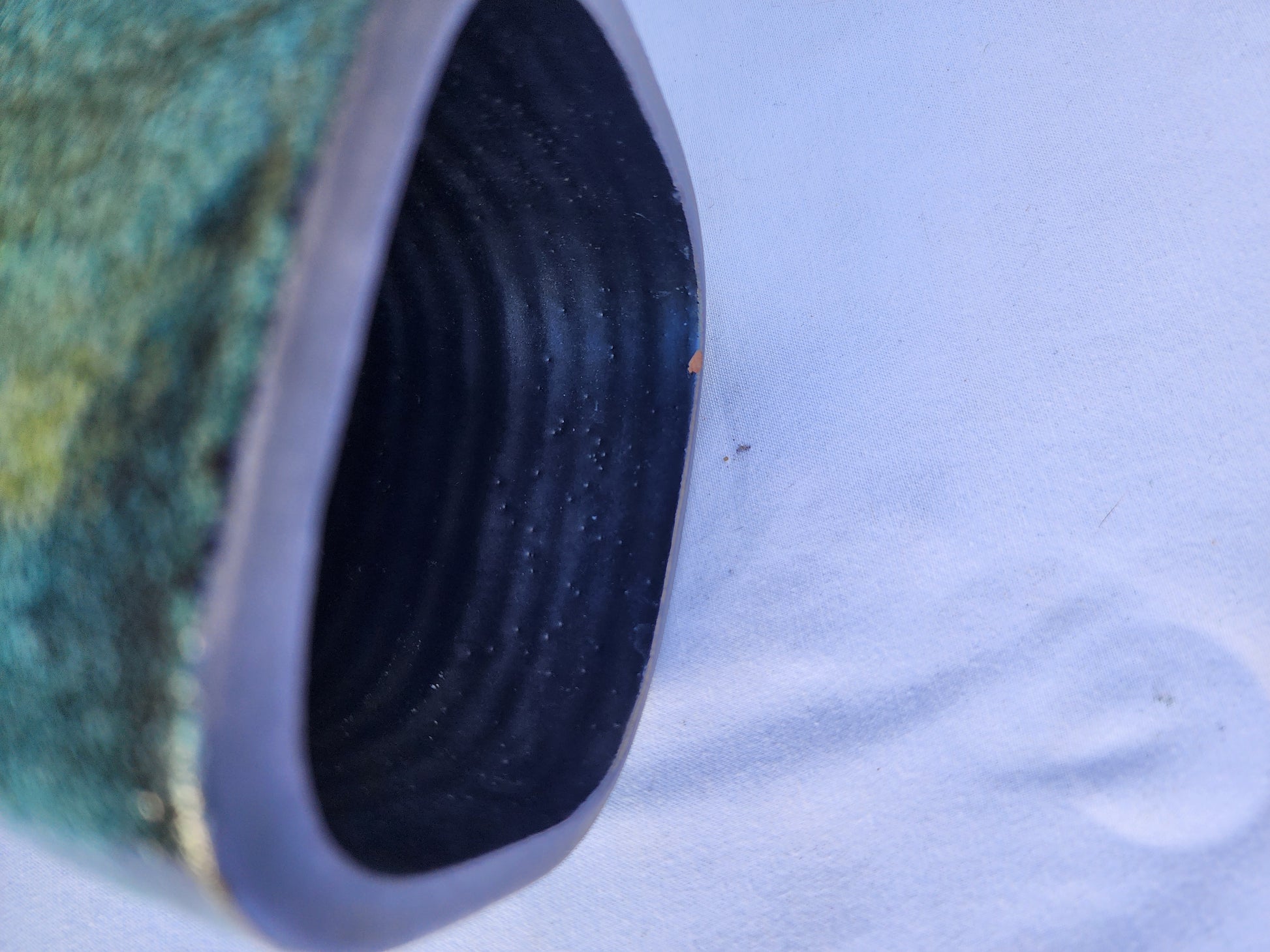 First of two blue vases by Pieter Groeneveldt (1889-1982), Dutch artist, ceramist, and poet whose work from the 40s and 50s is often associated with mid-century modern design. Signed on bottom with distinctive "PG Made in Holland" mark. Very good-excellent condition, with 1-2 tiny rim chips and a few dark pits that occur naturally in the process of making the "lava" textured finish.